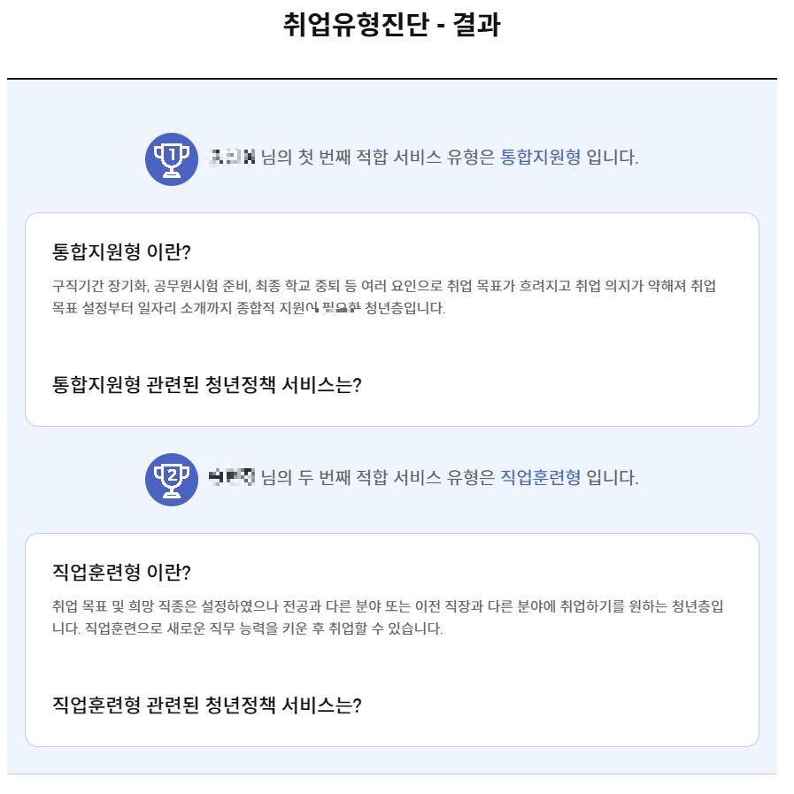 위에 있는 설문을 마치셨으면 본인이 설문한 토대로 취업유형진단이 나옵니다. 그거에 맞춰서 적합 서비스 유형이 나오면 그 유형으로 지원해 보시면 됩니다. 제가 취업유형진단 설문을 했을때에는 첫번재 유형은 통합지원형과, 두번째 유형으로는 직업훈련형 으로 결과가 나왔습니다.