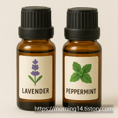라벤더, 시트로넬라, 페퍼민트 오일은 모기가 기피하는 향으로 유명합니다. 디퓨저에 활용하거나 직접 희석해 뿌리는 방식으로 사용해 보세요.