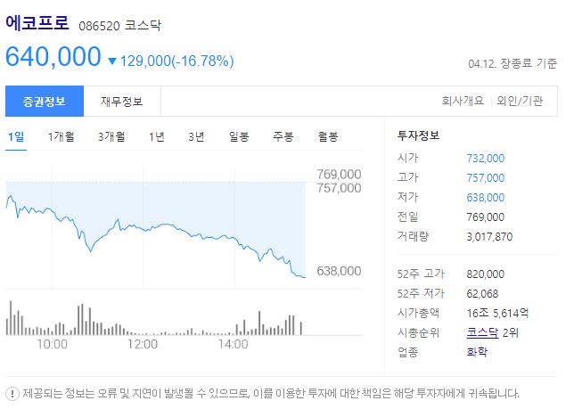 에코프로 주가는 12일 한국거래소에 따르면 장종료 기준으로 에코프로는 전 거래일 대비 16.78% (12만9000원)하락하며 64만0000원에거래되고 있습니다.