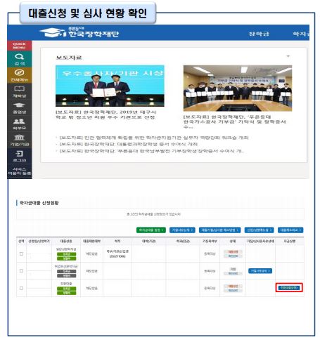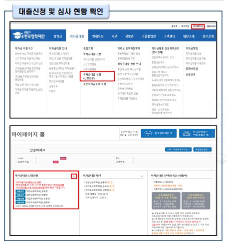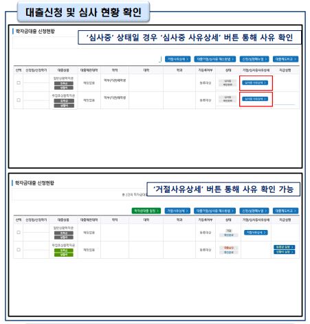학자금대출 신청현황에서 '심사 중' 상태일 경우 '심사중 사유상세' 버튼을 통해서 사유를 확인 주시고, '거절'인 경우는 '거절사유상세' 버튼을 클릭해 사유를 확인해 주세요.