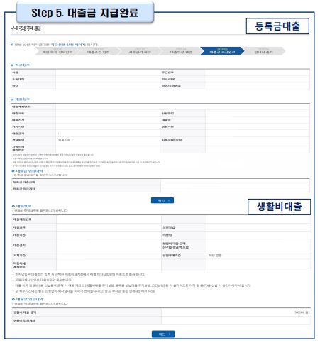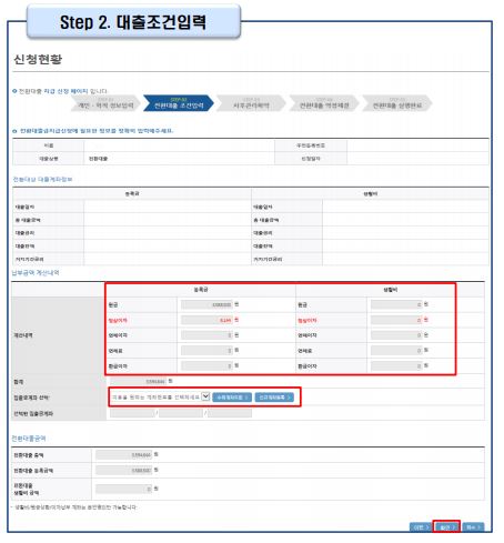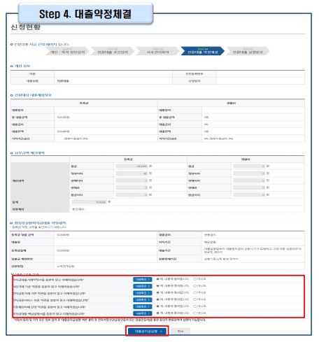 동의완료 하면 1단계 ~3단계 에서 입력했던 내용을 최종확인 해주세요. 당회차 실행 금액과 대출 총 약정금액이 표시됩니다.