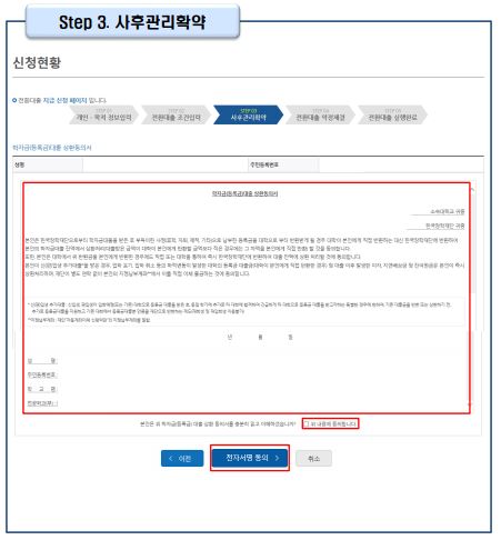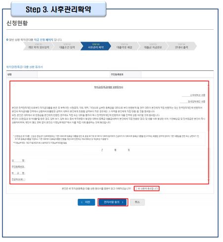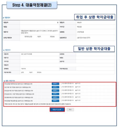 약정내용에 대한 약정서 동의단계 진행 및 전자서명 동의해 주셔야 취업 후 상환 전환대출이 완료됩니다.