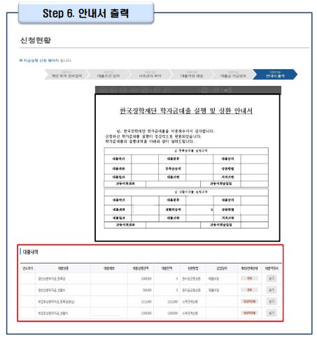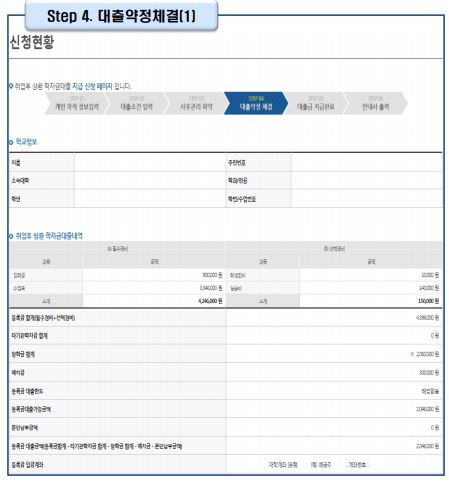 일반 상환 학자금대출(등록금/생활비) 실행 시 상환방법을 선택하신 후, 확인을 눌러주세요. 사후관리확약이 나타나면 동의에 체크하신 후에 전자서명동의를 클릭하세요. 1단계~3단계에서 입력했던 내용들을 최종확인합니다. 등록금은 수납원장에서 등록된 대학 입금계좌로 생활비는 학생 개인계좌로 지급됩니다.(기등록자 등록금 대출인 경우, 학생개인계좌로 지급됩니다.) 약정내용에 대한 약정서 동의단계를 거치고 대출금 지급실행 버튼을 선택하면 전자서명동의해 주세요. 대출금 지급내역이 완료되었습니다.