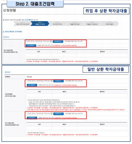 계좌번호(본인 명의 입출금 계좌 등록) 입력 관련 기존과 동일합니다. 전환대출 시 실행일 기준 기존 대출금에 대해 발생한 이자 및 지연배상금 상환 후 취업 후 상환 전환대출이 가능합니다.(본인 통장 잔고 보유가 필수입니다.)