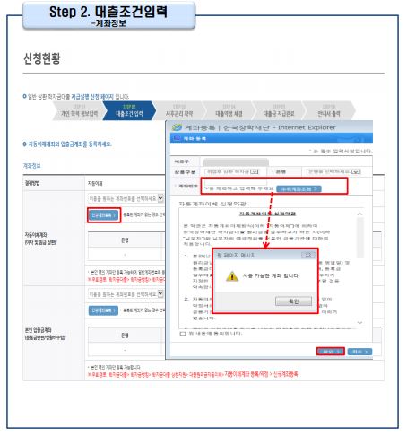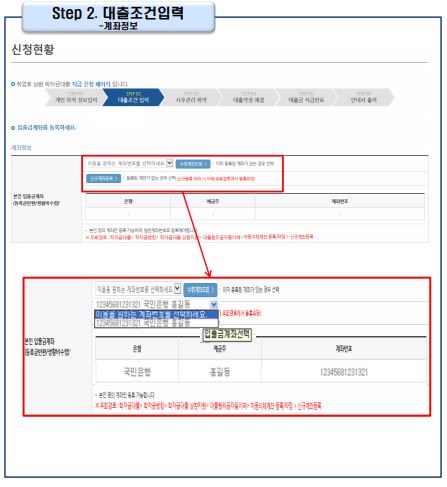 확인을 누르면 대출조건 입력창이 뜹니다. 본인입출금계좌확인 할 때 기존에 등록된 계좌 사용 시 등록된 계좌 선택 후 수취계좌조회를 눌러주세요.
