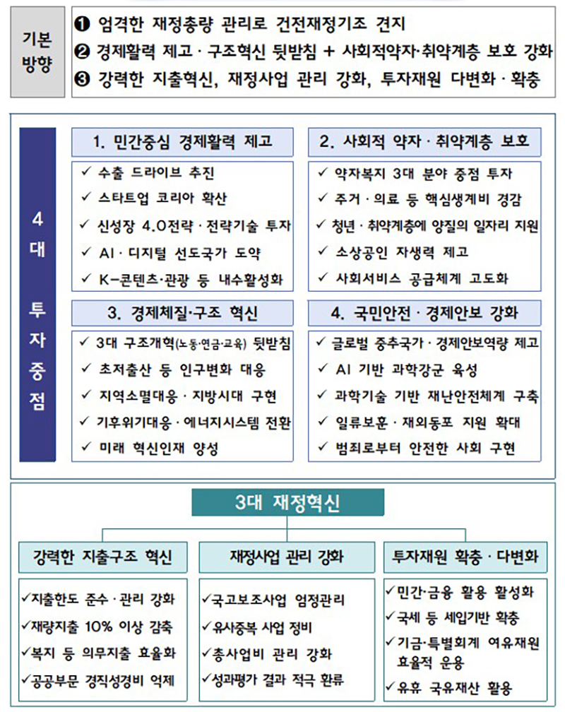 정부는 엄격한 재정총량 관리로 건전재정기조를 유지하면서 내년도 예산안 편성지침에 4대 투자중점과 재정혁신을 설정하였습니다.