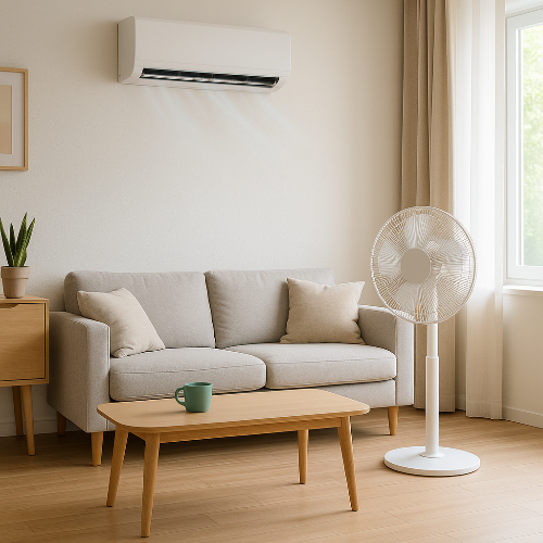 에어컨 바람을 고르게 퍼뜨리기 위해 선풍기를 함께 사용하면 체감 온도를 낮출 수 있어 약한 냉방으로도 충분한 효과를 볼 수 있습니다.